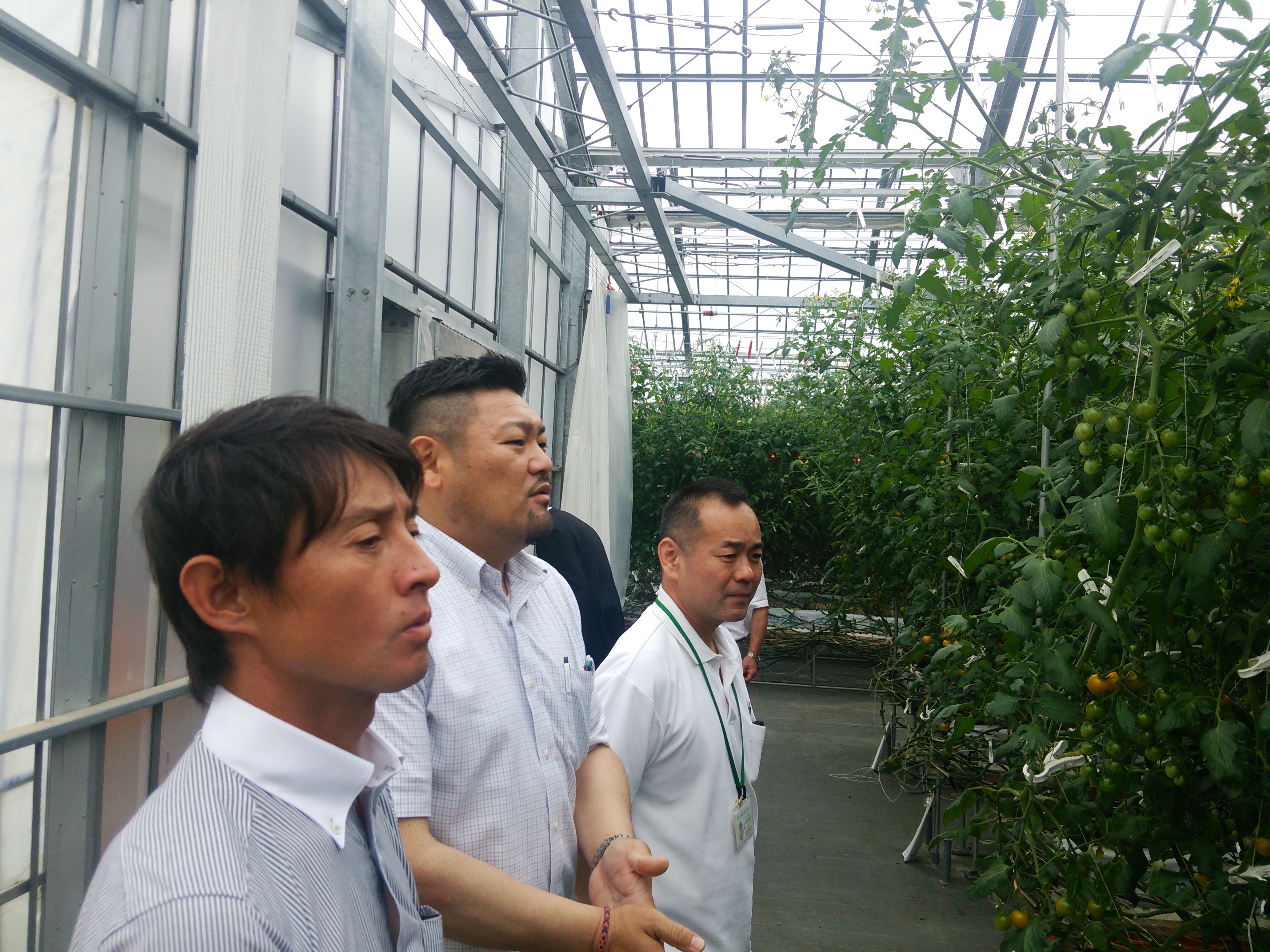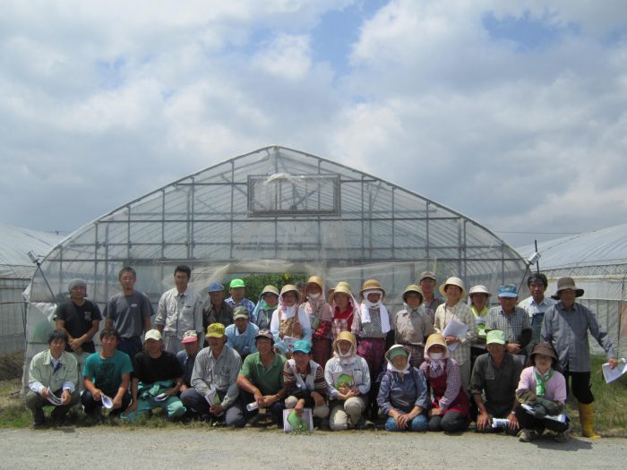 まつの担当者と一緒に他のまつの契約産地を視察。品質向上につなげるため、さまざまな栽培施設・技術を学び、研究を重ねています。