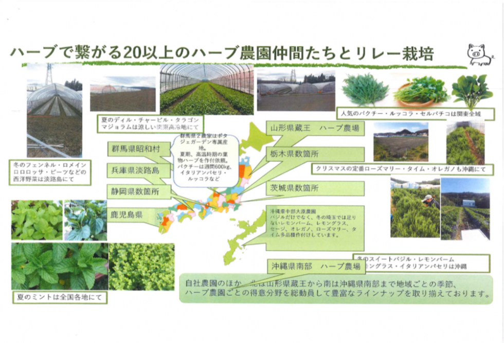 例えばクリスマス時期には、ローズマリーやバジルの栽培を埼玉や千葉、温暖な沖縄や鹿児島を活用して出荷量を安定させ、夏場のドリンク需要が高い時期には、スペアミントは埼玉や千葉、チャービルは高冷地の長野など、ニーズに最大限応えられる産地構成に努力されています。