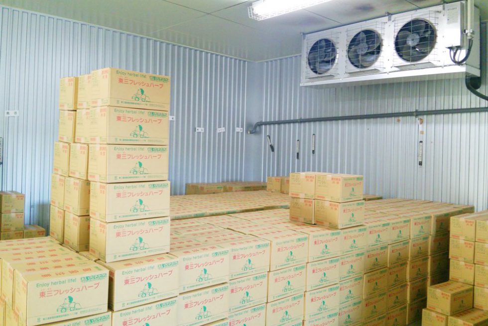各生産者から東三温室集出荷センターに入荷するハーブは出荷を待つ間、約10℃の冷蔵庫にて予冷をかけます。出荷の際には低温に弱いアイテムや、納品先が遠方で長距離輸送となる商品は、ハーブのケース(箱)をさらに二重構造のダンボール箱に入れ、輸送中の冷気による低温障害を防ぐなど、もきめ細かな養生を行っています。
