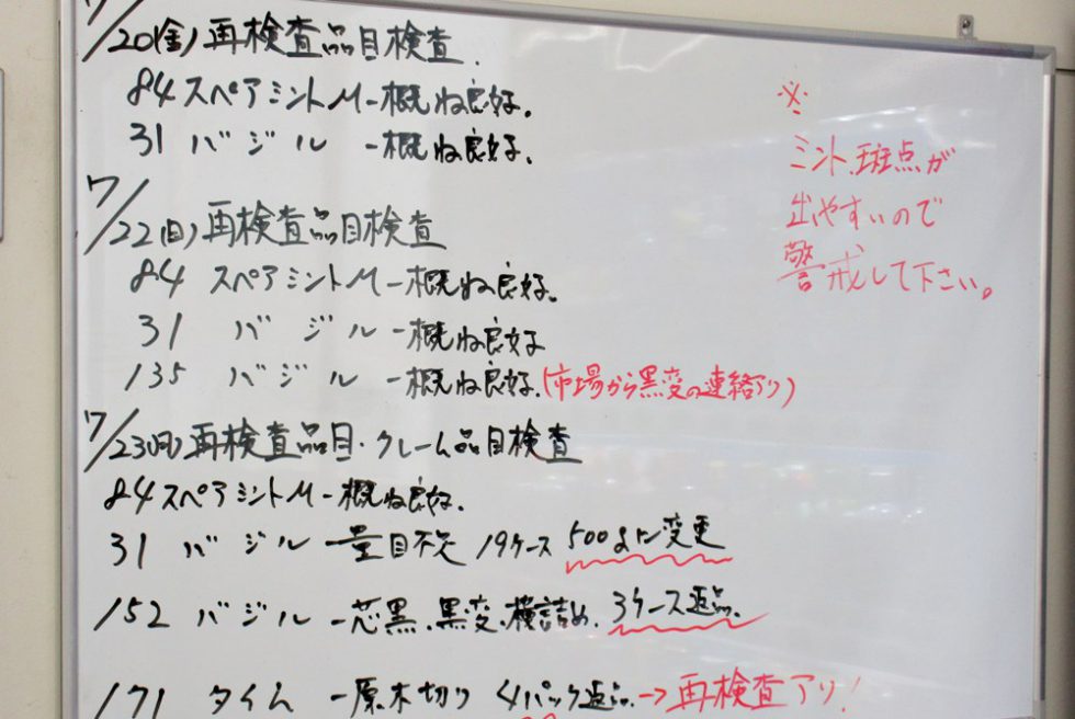 集出荷センターの各所にホワイドボードが設けられ、商品の規格・納品方法の周知や検品結果の共有を行っています。品質不良のクレームも生産者番号つきで詳細な内容を公開。クレームが発生した生産者は厳重検品対象となります。