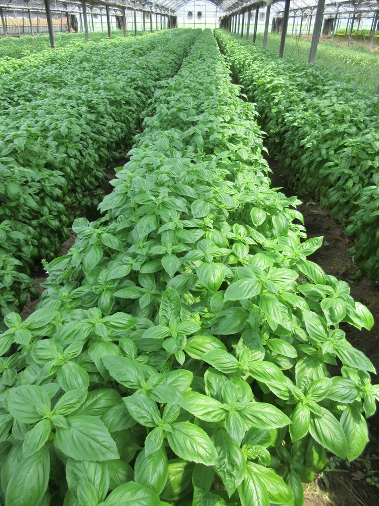 バジル。季節によって土耕・水耕栽培を組み合わせ、周年安定出荷を実現