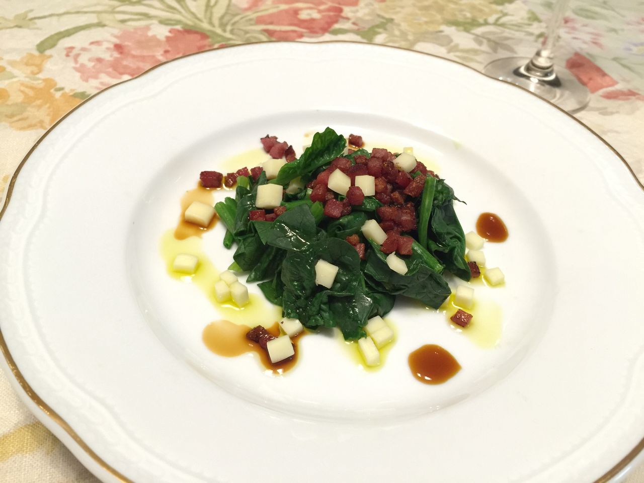 ほうれん草をさっと茹で、サラダスピナーでお湯をきり、お皿に盛り、カリカリベーコン、チーズ、アーモンドをトッピング。オリーブオイルと数滴のお醤油を垂らした簡単サラダです。