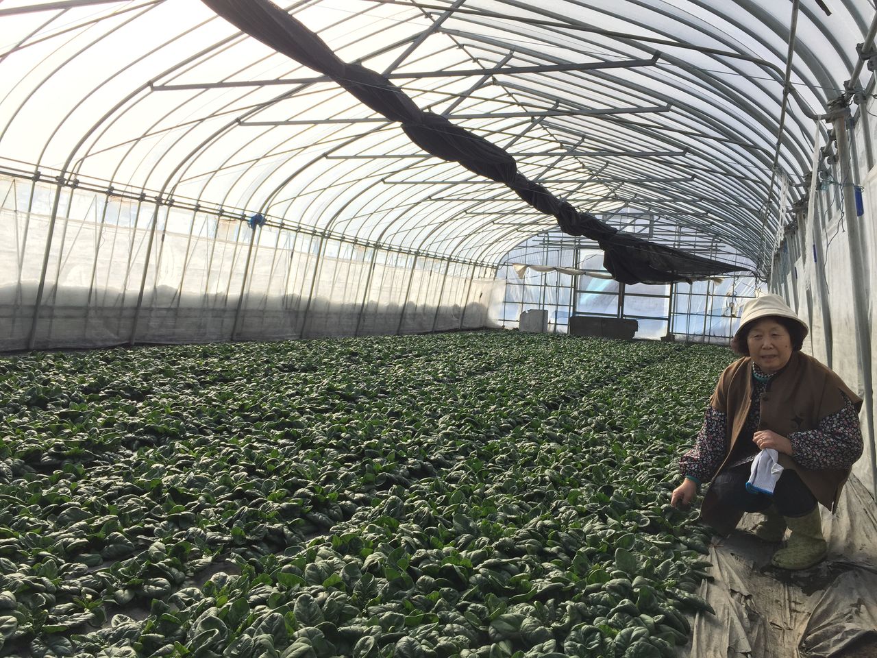 弘子さんは一人でハウス3棟を抱え、まる葉で適度なちぢみのある「冬霧」を栽培。